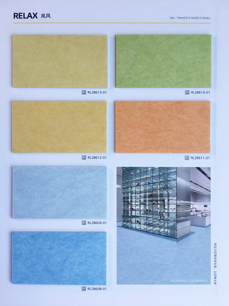 LG Hausys品牌嵐風 (RELAX1.8)無甲醛,環保健康,不含鄰苯二甲酸酯類增塑劑和重金屬,不添加任何回收材料;原料采用環境友善型可再生資源;添加抗菌劑。出色的防滑性能,經濟耐污、易清理、施工簡單、使用壽命長。適用場所:教育空間、連鎖店、辦公室。