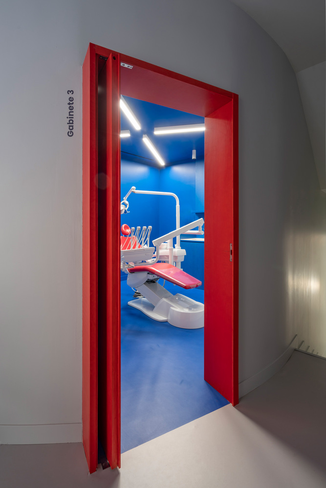 今天這個項目案例是位于西班牙馬德里的Impress牙科診所,這家診所主要針對年輕用戶,相較印象中醫院往往以白色為主色的設計風格,這個項目大膽制造了紅色與藍色的碰撞,營造出了強大的視覺沖擊。